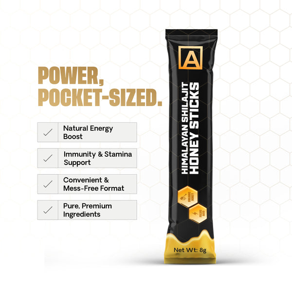 Each stick packs 500mg of Himalayan Shilajit + adaptogenic herbs in raw honey — designed to fuel energy, testosterone, and performance in seconds.